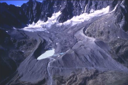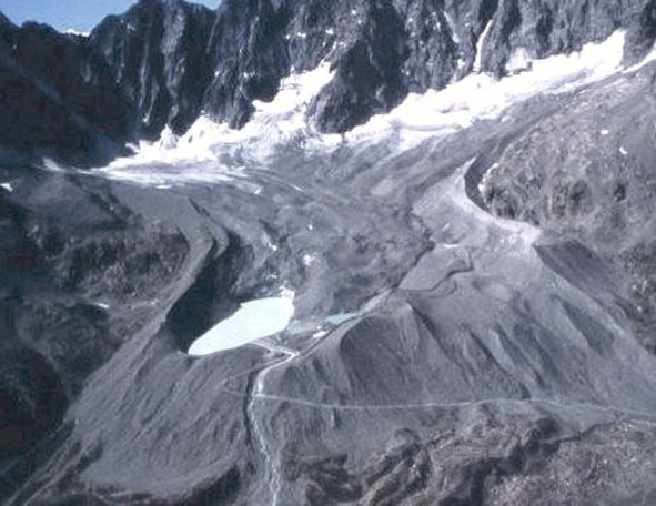 À gauche , une vue aérienne datant de 1969, prise vers l'Est (haut vallon du Tabuc, ph A. Pêcher). Derrière la grande moraine frontale, le lac d'Arsine. À cet époque, il y avait un seul lac. Le front glaciaire l'atteignait, et le glacier pouvait vêler (s'effondrer) dangereusement dans le lac.