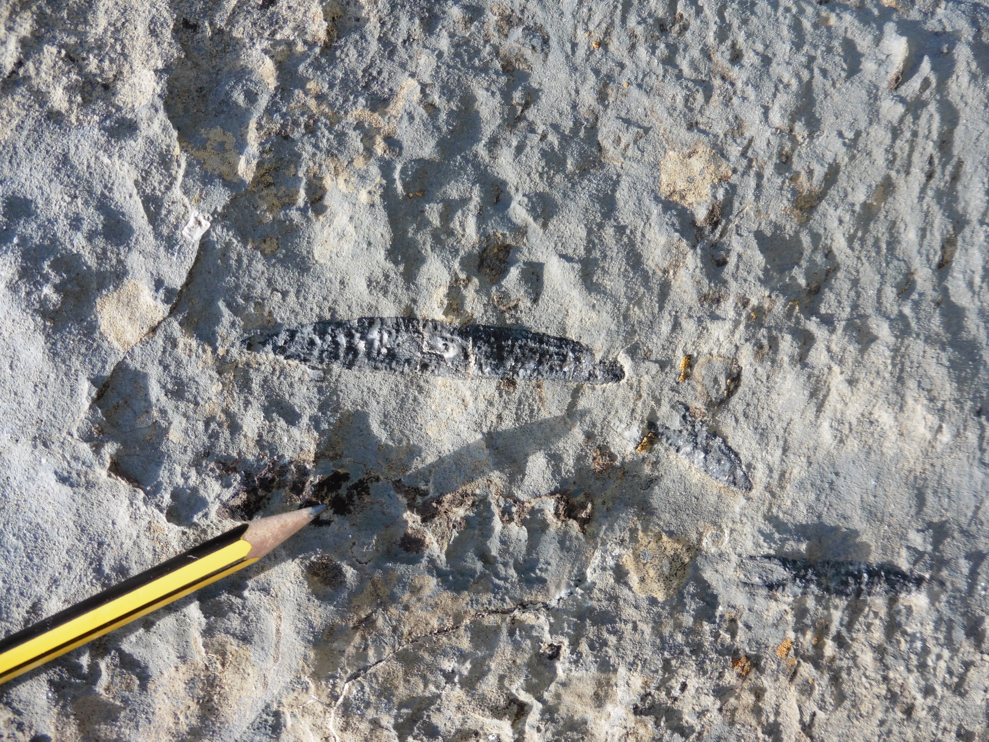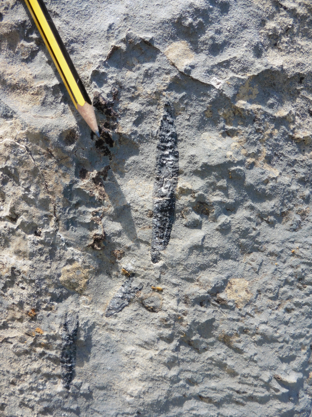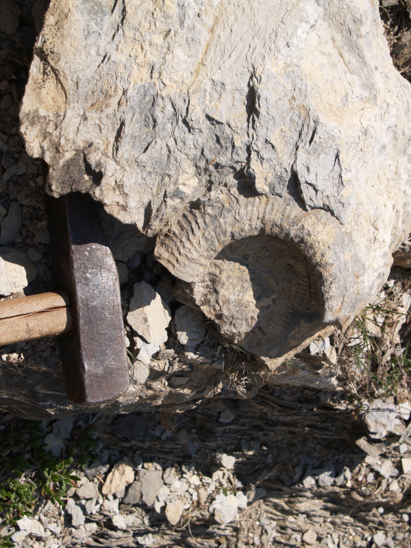 Peu en amont du refuge affleurent des calcaires riches en fossiles (ne pas en prélever !), surtout des bélemnites (anciens céphalopodes ressemblant aux seiches actuelles. Seul le rostre, en forme de balle de fusil, est fossilisé) (photo de gauche, Pêcher, A. et Tordjman, P., 2018) et (photo de droite) quelques ammonites (un autre type de céphalopode, ressemblant au nautile actuel). Ils ont été datés du Jurassique moyen (environ 170 Ma). Le Jurassique inférieur est donc très mince, certains étages manquent même sans doute : ces sédiments se sont sans doute déposés sur un ancien relief sous-marin.
