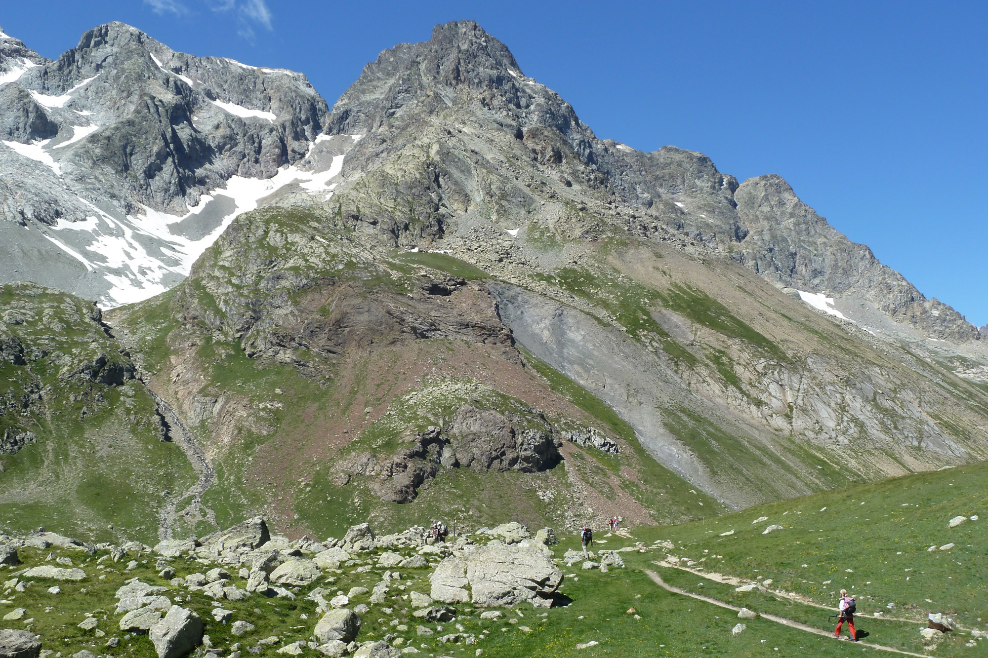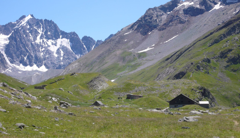À gauche - Dès l'abord du refuge, tout le vallon d'Arsine se dévoile, jusqu'à la Montagne des Agneaux (3 664 m) au fond, et à son pied les hautes moraines du Glacier d'Arsine, où se nichent les lacs d'Arsine.