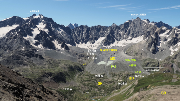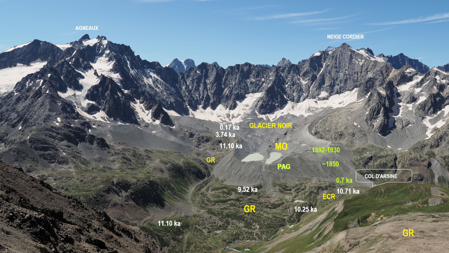 Les dépôts morainiques, exceptionnellement conservés dans cette partie du massif des Ecrins, « racontent » l’histoire des glaciers depuis le début de l’Holocène (11 000 ans avant nous, soit 11,1 ka BP). On y trouve les restes des dernières langues glaciaires du Dryas Récent, réactivées au début de l’Holocène (oscillation Préboréale à 11,1 ka BP) sous la forme de glaciers rocheux aujourd’hui inactifs (GR). Le glacier rocheux formant le soubassement des moraines non couvertes de végétation du glacier d’Arsine remanie un gigantesque écroulement venant de la crête Agneaux-La Pyramide daté de 10,71 ±0,42 ka BP), dont des restes affleurent au col d’Arsine (ECR). Le grand vallum morainique non couvert de végétation (MO) représente le Petit Âge Glaciaire (XIV-XIX siècle). A l’extérieur de ce vallum, rive droite, les restes d’une avancée néoglaciaire datés à 3,74 ka BP. En arrière, le Glacier d’Arsine couvert de débris (« glacier noir ») et avec des lacs proglaciaires dont le plus ancien rive droite s’est développé à partir de la fin des années 1940 (archives IGN).