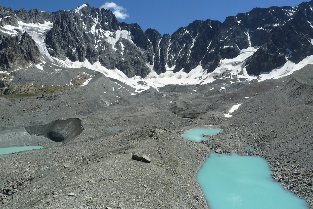 A droite, vue vers l'amont des lacs d'Arsine en 2012 (ph. A. Pêcher). Avec le retrait glaciaire, un second lac est apparu, puis un troisième lac s'est ajouté aux précédents, alors que le front du glacier, bien visible sur cette photo (niche raide, peu en arrière du lac de gauche et en arrière des lacs de droite), continue à reculer