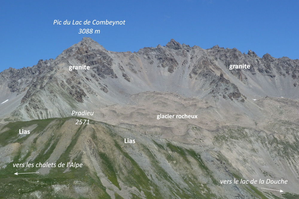 De la morraine du Glacier d'Arsine, on a en face de soi le versant Sud du massif du Combeynot. A la base, dans les pentes herbeuses, les calcschistes gris-bleutés du Lias et du Jurassique. Au dessus, une partie pierreuse peu raide, où se nichent des bourrelets qui évoquent des moraines encore actives : il s'agit d'un glacier rocheux. Au dessus, les pentes ruiniformes sont faites de granite du Combeynot. Le cristallin ancien vient donc chevaucher la couverture sédimentaire plus jeune.