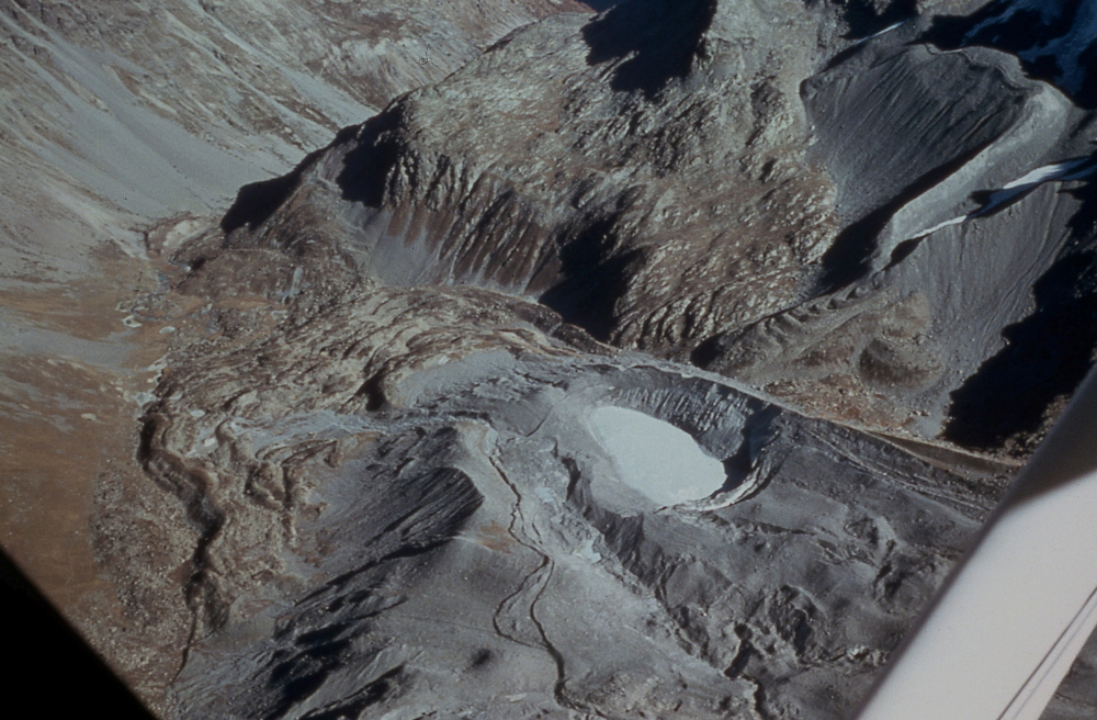 A gauche : le lac d'Arsine en 1986, à la fin des travaux de creusement de l'exutoire (ph L. Reynaud). La piste creusée pour les travaux est bien visible, recoupant en biais le front morainique.