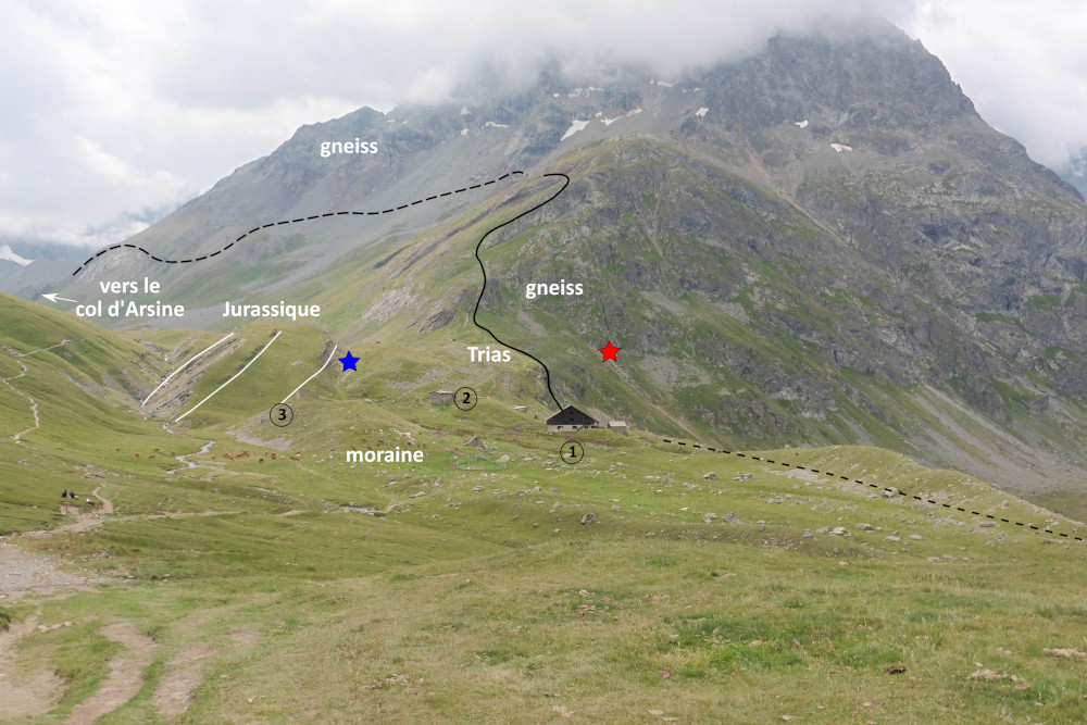 L'étoile bleue correspond à des affleurements riches en fossiles (les admirer, mais ne pas en casser ni en récolter, même sur des blocs détachés !). L'étoile rouge marque l'entrée de l'ancienne mine de l'Alpe.