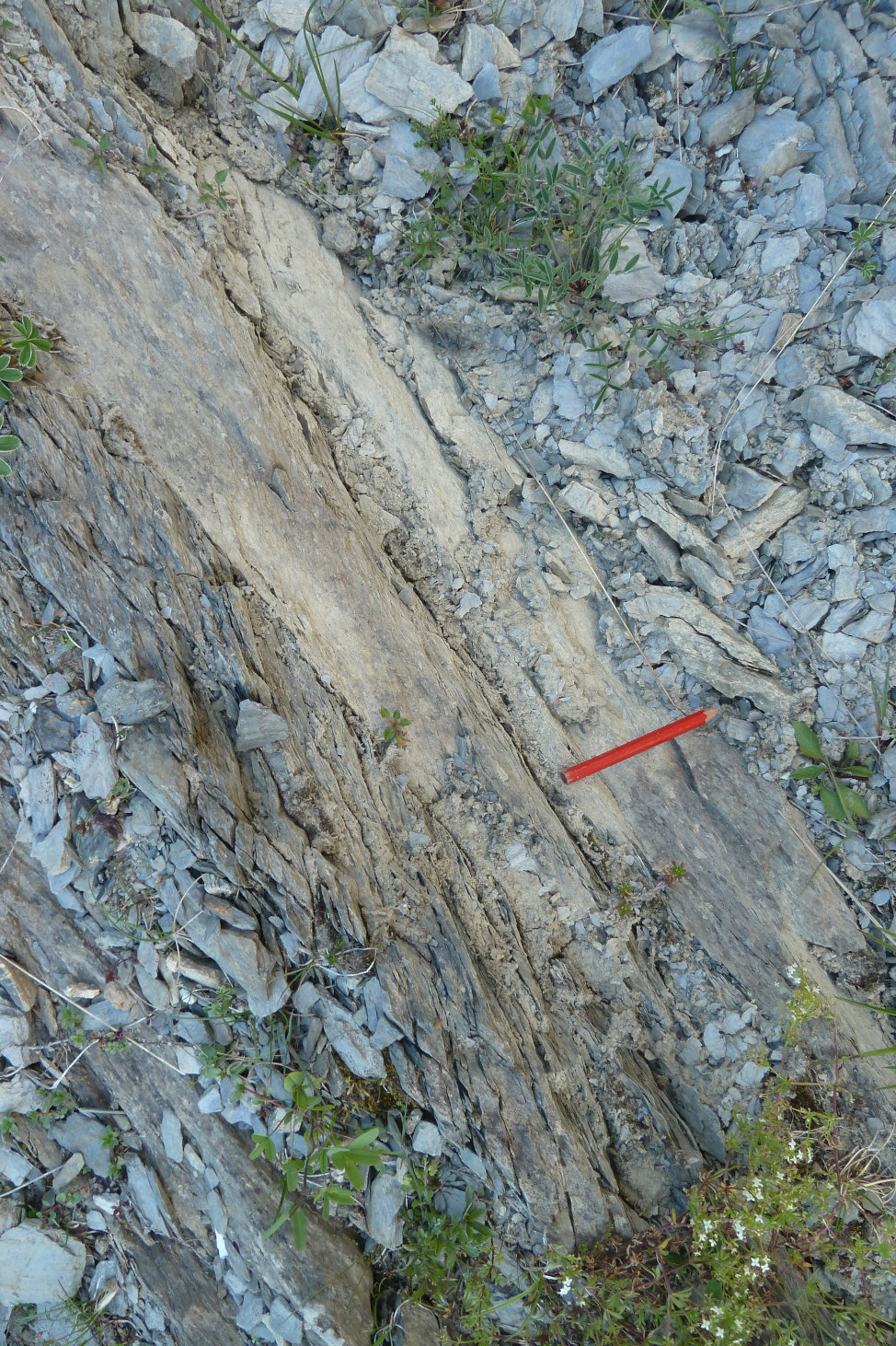 Sur cette photo, des faciès plus clairs et plus massifs que la majorité des calcschistes recoupés par le chemin. On sépare bien la schistosité, très raide, selon laquelle la roche se débite en fines plaques (débit feuilleté, partie gauche de l'affleurement), et la stratification, moins raide, marquée par la limite entre un gros banc massif clair et en dessouss de lui une zone moins massive, sans doute un peu plus argileuse et plus affectée par la schistosité