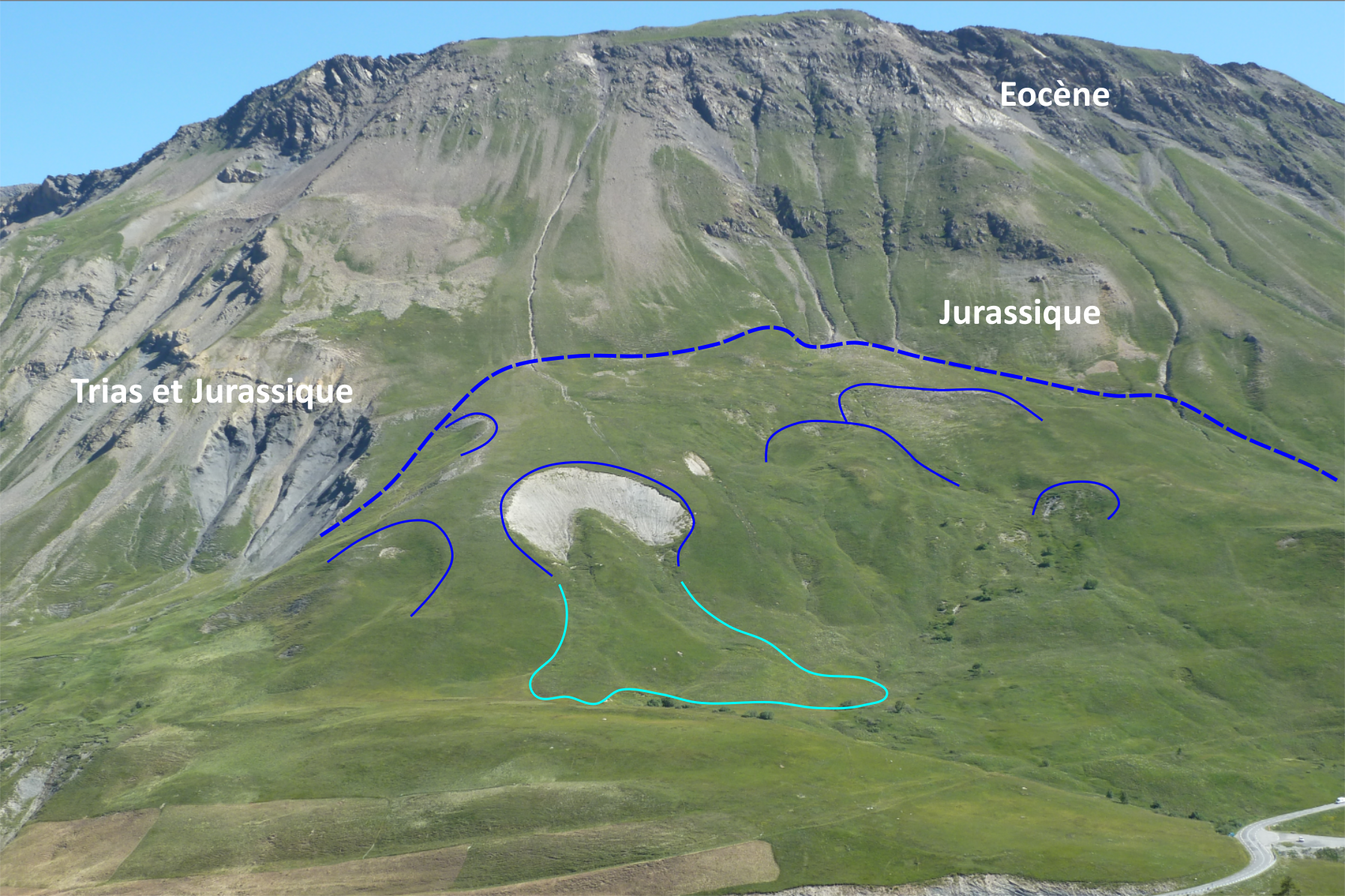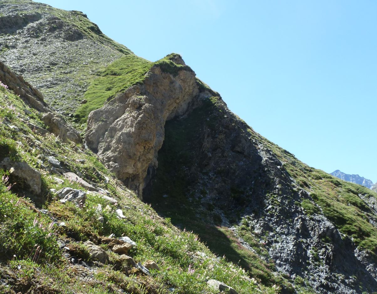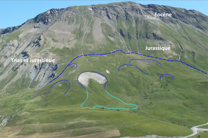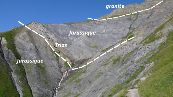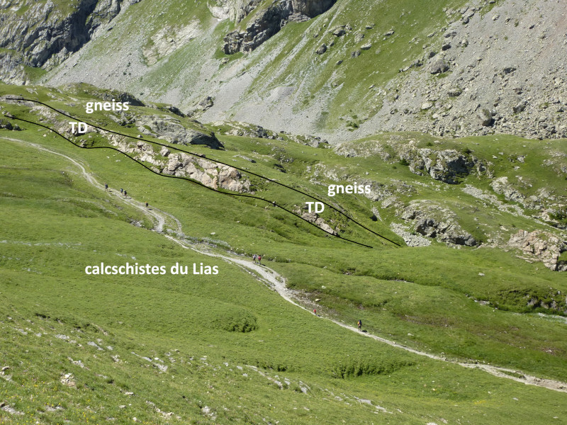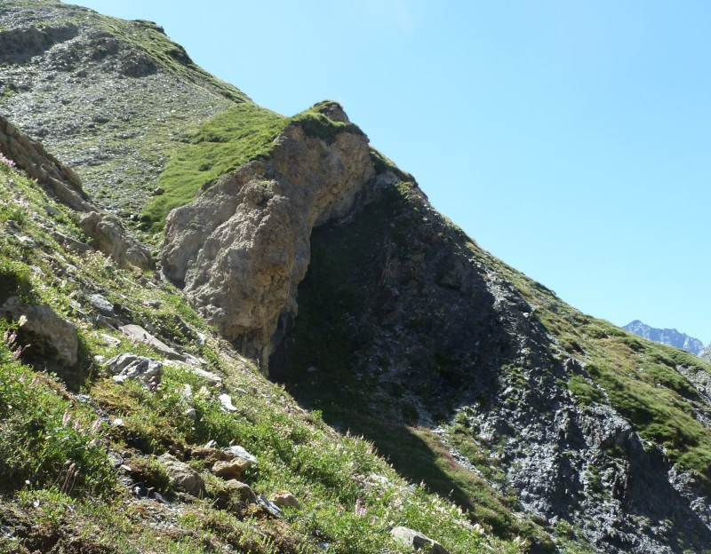 Après avoir dépassé l'éperon, en se retournant on voit que les couches sont ici très raides, elles descendent vers l'Ouest. De droite à gauche, se succèdent les calcschistes liasiques, puis la barre de dolomies claires triasiques. Le cristallin est juste à l'Ouest, en contrebas de la falaise. Lors du raccourcissement alpin, la série a donc été renversée.