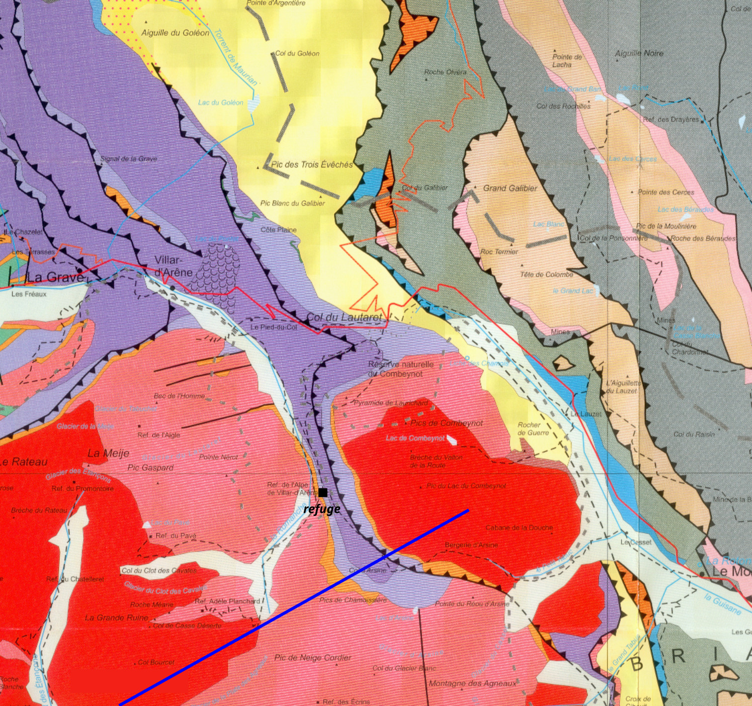 Pour évoquer la géologie de cette zone de l'Alpe de Villar-d'Arêne, on parle communément du synclinal d'Arsine : ce n'est pas un synclinal au sens rigoureux du terme, mais comme le montre la coupe géologique ci-dessus, une partie de la couverture sédimentaire du massif pincée, écaillée et très déformée entre deux blocs du socle cristallin, le Combeynot et le massif des Écrins. La coupe est orientée SO-NE.