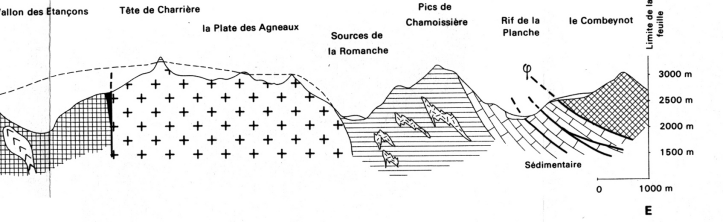 À gauche, une carte simplifiée de la partie Est du massif des Écrins, du Combeynot et de la Haute Guisane (extrait de la carte géologique au 1:100 000e éditée par le Parc National des Écrins). À droite, une coupe géologique allant des Étançons, au Nord de la Bérarde, jusqu'au Combeynot, selon le trait bleu épais reporté sur la carte (d'après la notice de la feuille BRGM St Christophe en Oisans). Elle recoupe les formations sédimentaires du synclinal d'Arsine.