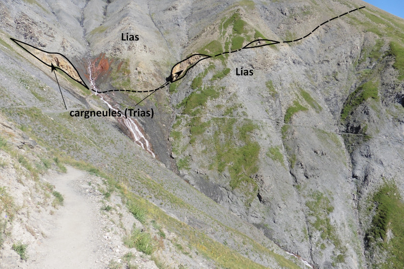 La répétition des calcschistes noirs du Jurassique en dessous et en dessus du Trias est anormale. Elle est due ici à un chevauchement à l'intérieur de la couverture sédimentaire, bien souligné par les rognons de cargneules. C'est une réplique du chevauchement principal du Combeynot, qui n'est donc pas un simple plan tectonique, mais plutôt un faisceau de plusieurs chevauchements.