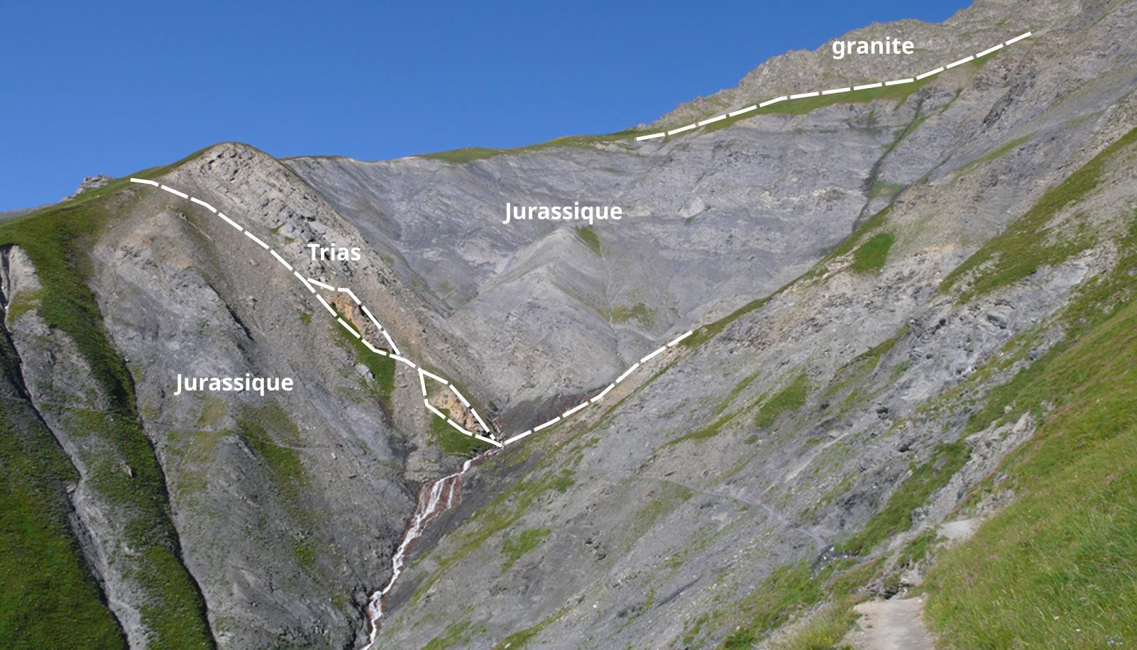 À gauche : l'entrée dans le ravin du Colombier, vue vers le Sud. A l'intérieur des calcschistes sombres, la trace d'un chevauchemet intra-sédimentaire souligné par des lambeaux de cargneules triasiques. À droite, le même passage, mais vu de la sortie du ravin, en regardant vers le Nord. On voit nettement dans le haut du ravin le granite qui est au dessus des calcshistes, qui s'enfoncent sous lui. De même plus bas, au niveau du chamin, les calcschistes jurassiques du bas du versant s'enfoncent sous les cargneules triasiques. Autant d'évidences de la tectonique régionale, en écailles chevauchant vers l'Ouest, dans un mouvement global de racourcissement Est-Ouest !