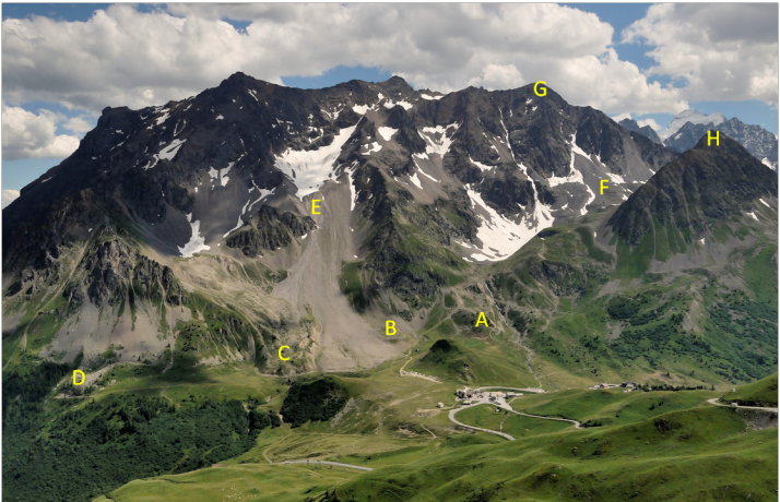 À droite, une vue panoramique sur le versant nord du Combeynot depuis la route du Galibier (Ph. B. Francou). Sous cet angle, les formations quaternaires, très développées, sont bien visibles : A/ le glacier rocheux de la sortie de la Combe de Laurichard, B/ le glacier rocheux de la bergerie, C/ le glacier rocheux du Lautaret, D/ la "moraine de névé" du Lautaret, E/ le Glacier du Combeynot, avec sa moraine datant du petit âge glaciaire, F/ le glacier rocheux actif de Laurichard, G/ le Roc Noir du Combeynot (3 112 m), H/ la Pyramide de Laurichard (2 687 m). Le repères A à D sont des glaciers rocheux datant du Dryas récent (voir plus bas).