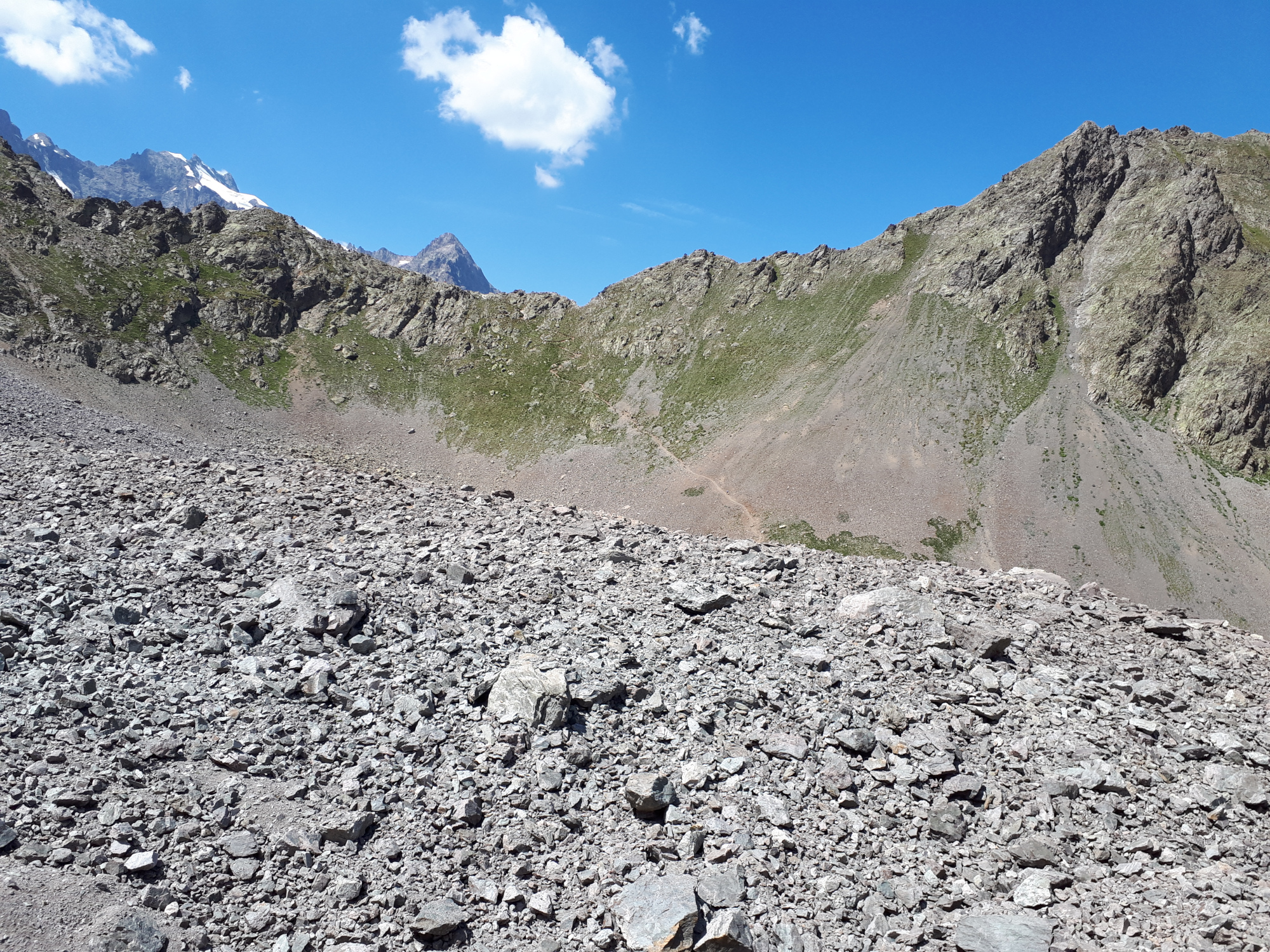 À gauche : le Col de Laurichard (2 654 m), vu depuis environ 2 600 m d'altitude, sur le glacier rocheux au pied Nord du Roc Noir. En arrière plan, à gauche du col, La Meije (3 983 m). On distingue le chemin du Col. Là où il apparait derrière la pente caillouteuse du premier plan, les affleurements partiellement recouverts d'herbe sont formés de granite. Dans la montée terminale, le chemin recoupe des affleurements de nature variée, gneiss et/ou granite