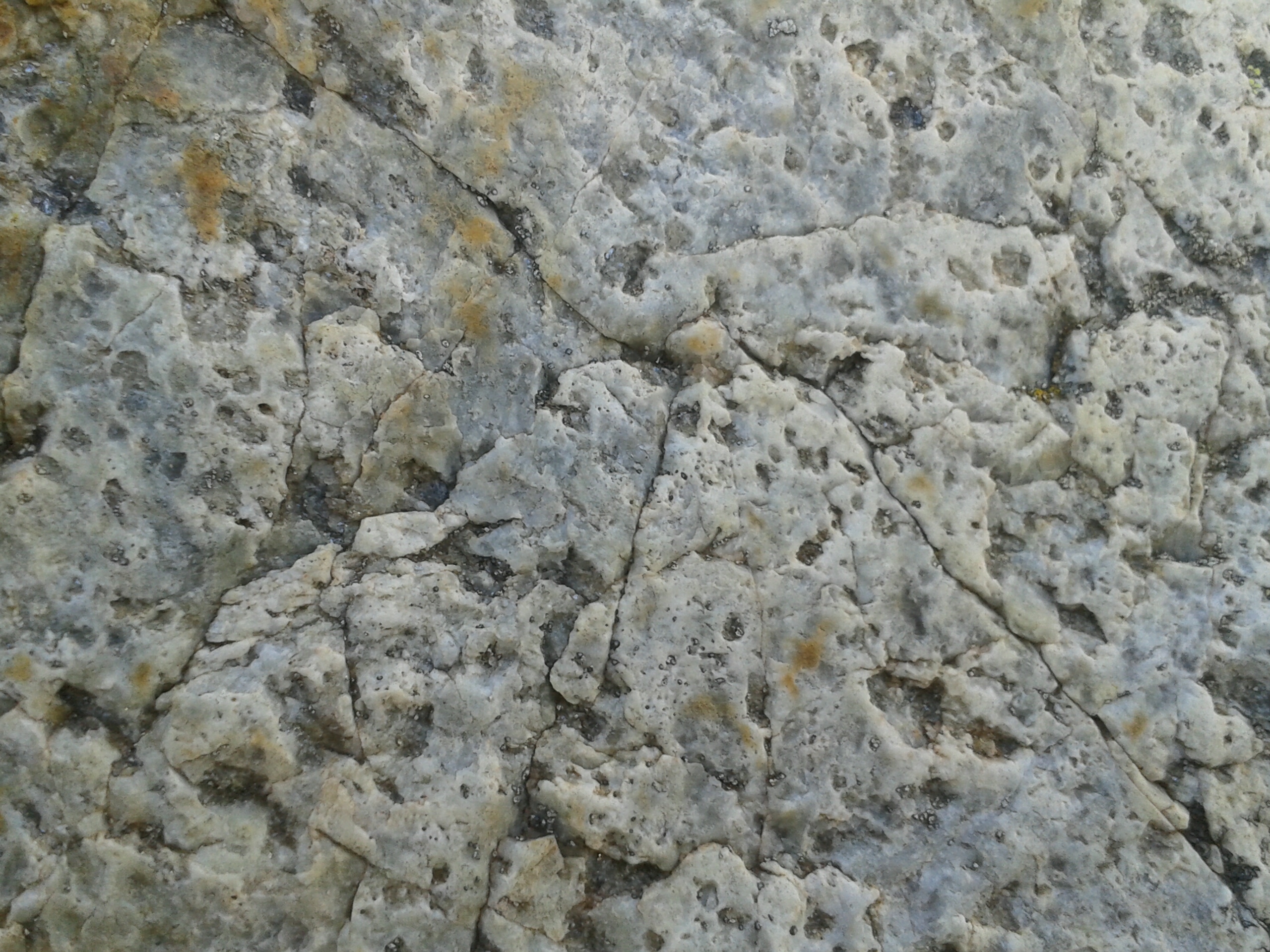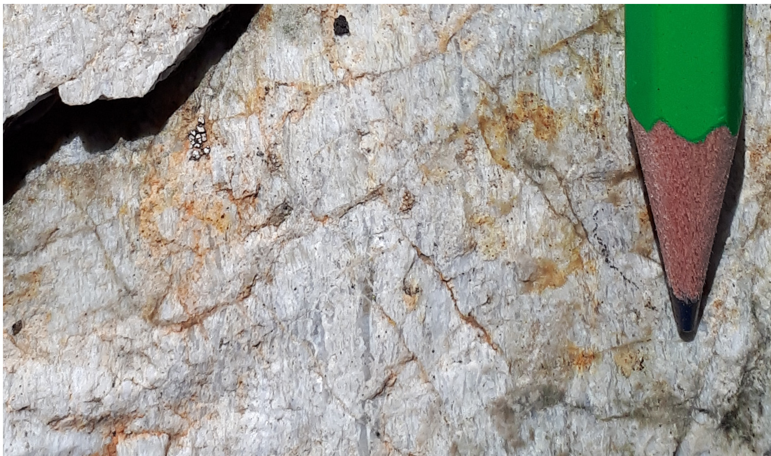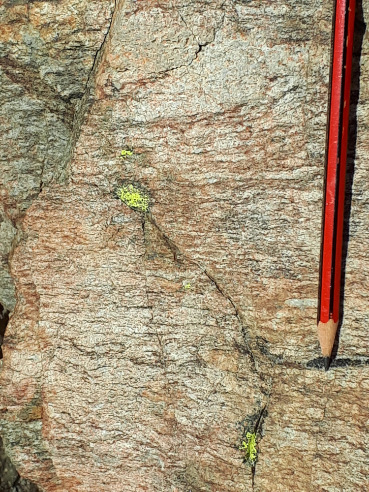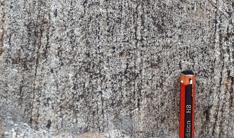 Le chemin de montée dans la Combe de Laurichard depuis le Col du Lautaret atteint très vite des affleurements de gneiss, qui à première vue rappellent beaucoup les gneiss "banaux" du massif des Écrins (photo de gauche). Mais en se déplaçant latéralement de part et d'autre du chemin (surtout vers l'Est), on touche des affleurements souvent faits d'un gneiss à aspect très particulier. Il est très massif, très blanc, sans cette alternance de lits sombres et de lits clairs si caractéristique des gneiss courants. Si on regarde de plus près, on voit quand même qu'il a une structure planaire nette, marquée par des petites lentilles très étirées, d'un gris huileux : il s'agit de "flammes" de quartz, isolées dans une matrice à grain fin quartzo-feldspathique (photo du centre, la foliation métamorphique est parallèle au crayon). Localement, cette orientation disparaît, le gneiss passant à une roche toujours à grain très fin, mais parsemée de petits grains 1/2 centimétriques globuleux ou anguleux, du même quartz à éclat huileux (photo de droite). On reconnaît alors une rhyolite, une lave peu fréquente dont la composition est celle du granite (c'est l'équivalent éruptif, cristallisé en surface ou très près de la surface, du granite, cristallisé lui en profondeur et plus lentement).