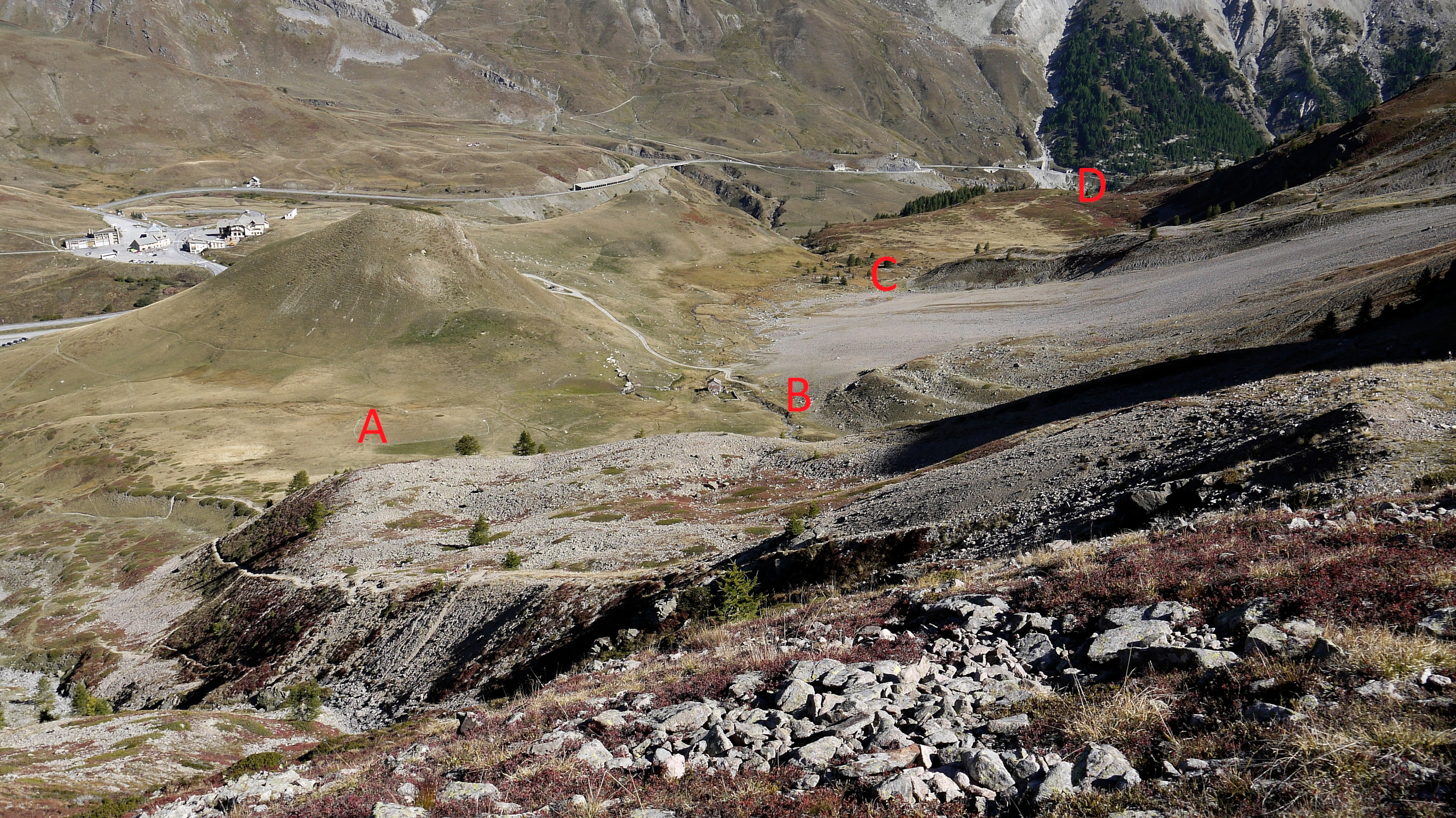 À droite - Depuis la galerie de la Marionnaise, un peu en aval du col du Lautaret coté Guisane : la "moraine de névé" du Lautaret (D sur la photo de gauche), interprétée dans le passé comme un dépôt lié à la persistance d'un névé sur lequel glissent les chutes de pierres avant de s'arrêter au pied. Cette forme de bourrelet est reconnue de nos jours pour être un petit glacier rocheux.