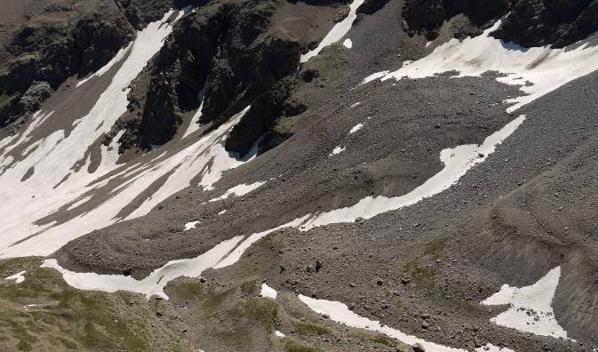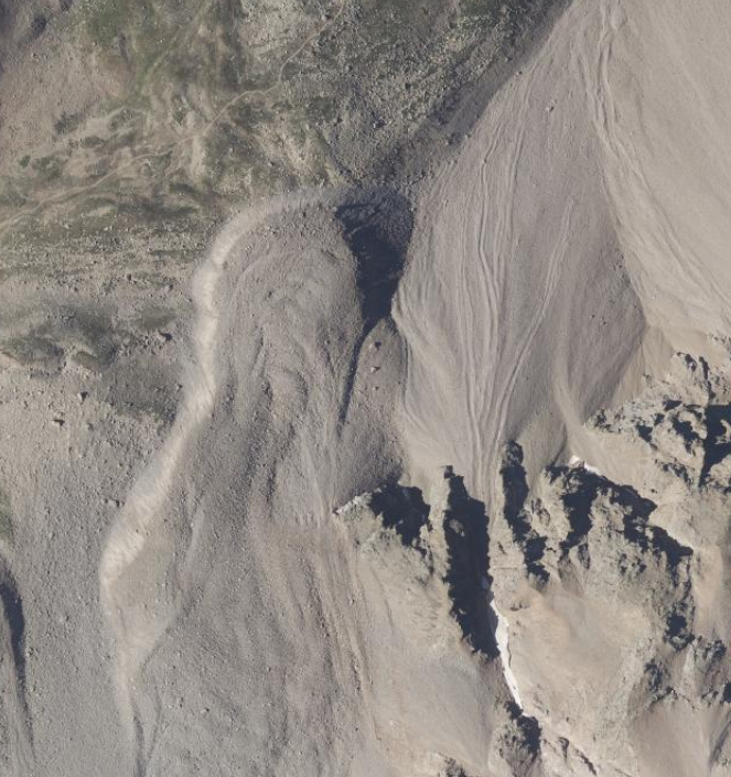 À droite, une vue aérienne du même glacier rocheux (image IGN-Géoportail, vue vers le Nord). On distingue très bien le glacier rocheux (la langue bourrelée dans la partie centrale de la photo) et à sa droite un grand cône d'avalanche et torrentiel, dont les génératrices presque parfaites sont soulignées par quelques chenaux dûs à des écoulement orageux récents