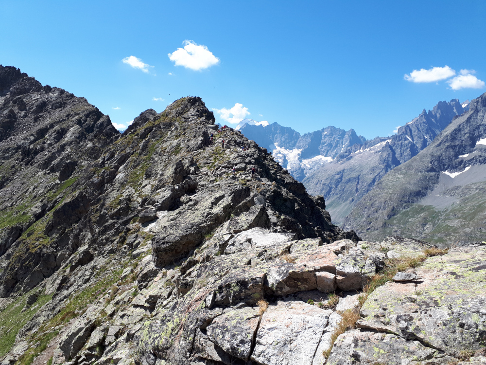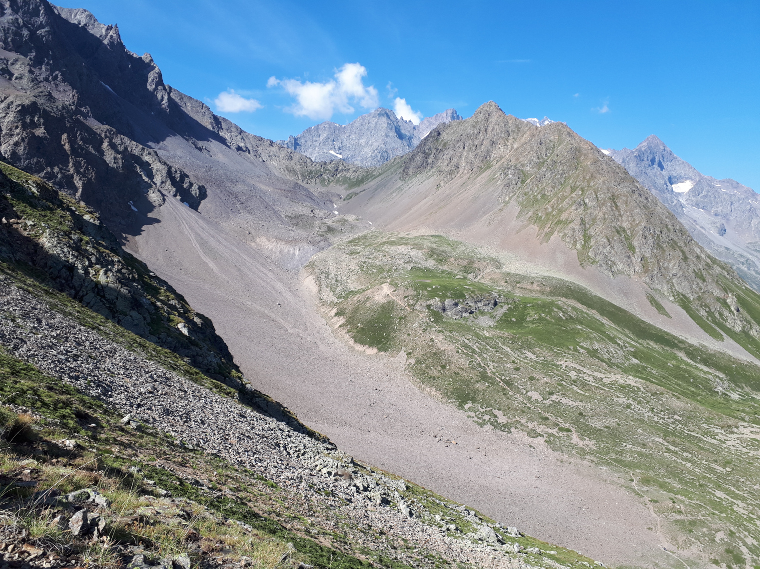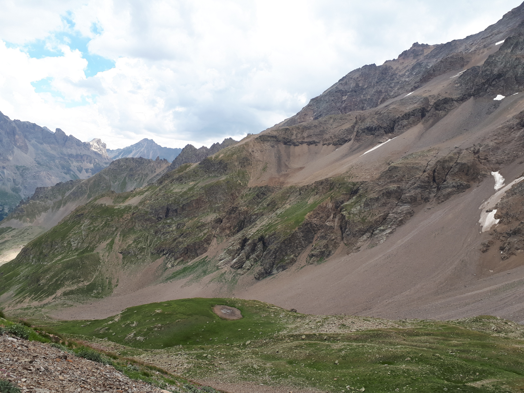 À droite : juste à l'est du Col, sur du granite très clair. En arrière plan, la vue sur le fond du vallon de la Plate des Agneaux, avec au second plan à droite le chainon de Roche Méane, puis derrière à gauche les sommets de Roche d'Alvau (3 628 m) et de Roche Faurio (3 730m). Au dernier plan, derrière Roche Faurio, on devine les Écrins (4 102 m).